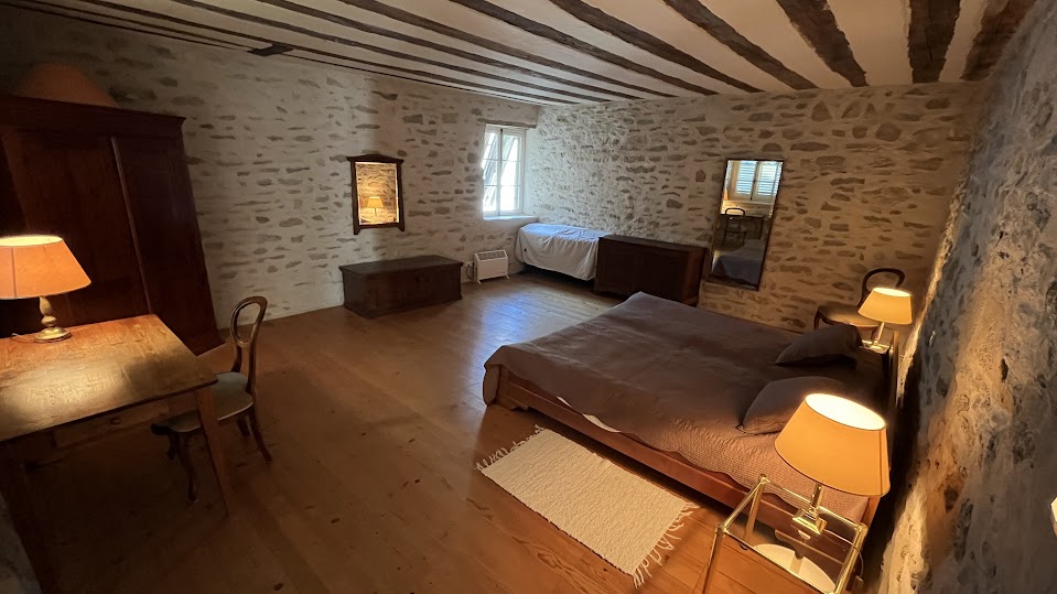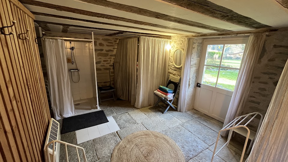 Ambiance authentique dans le gite de la grange : dalles de pierre, cheminée, qui donne directement sur le jardin au bord du ruisseau ! Au rez-de chaussée la cuisine, la petite chambre et la salle de douche. A l’étage : le salon et la grande chambre.