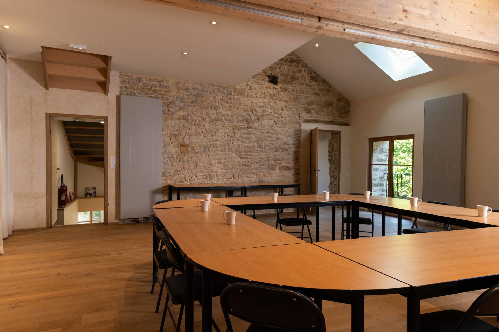 1er étage – Salle équipée d’une cuisine, 20 m2. Idéale pour des formations ou activités créatives jusqu’à 10 personnes.