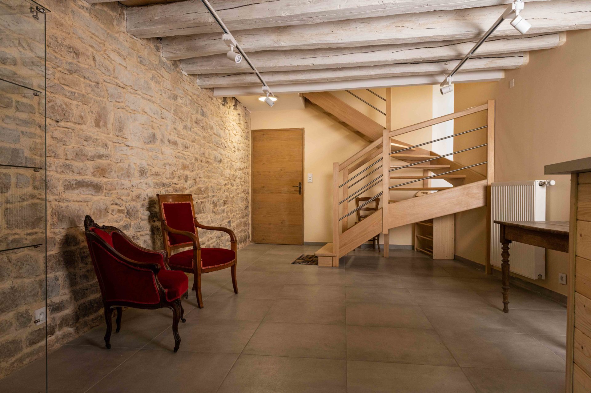 Equipé d’une banque d’accueil, une vitrine, il se pare de couleurs chaleureuses et des pierres et poutres.